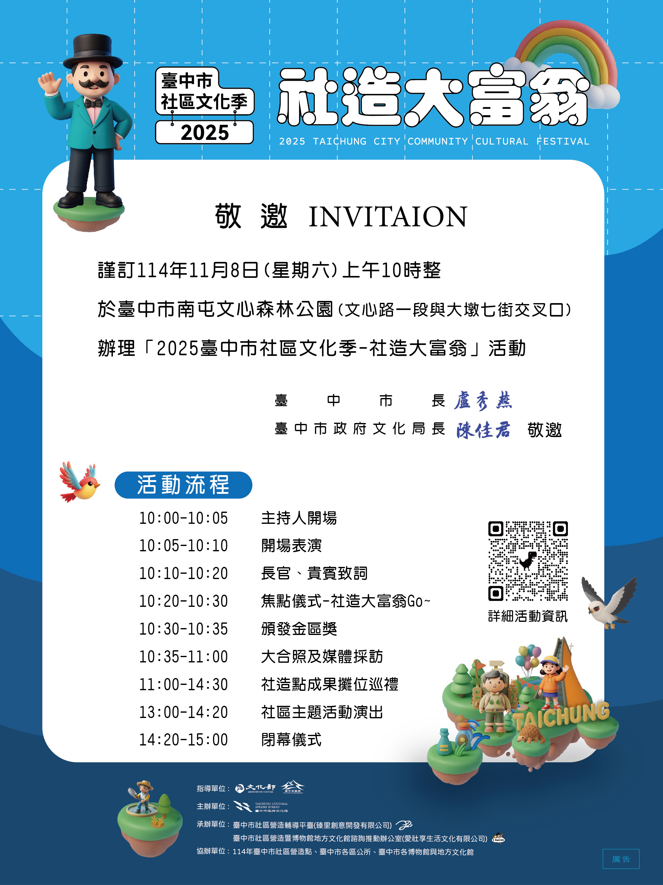 為展現臺中市社區營造成果,串聯114年度社造點、各區公所、社區大學等,共同呈現社區的主題特色,於本市文心森林公園南側溜冰場(文心路一段與大墩七街交叉口)上午10時至15時舉行,歡迎踴躍參加。