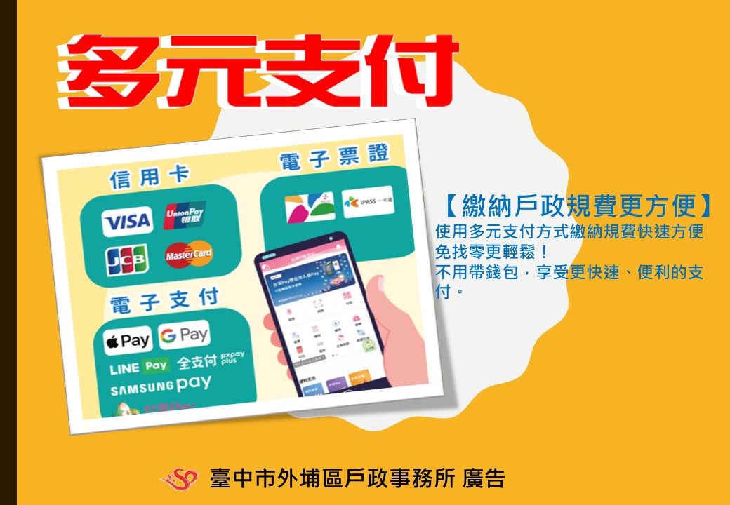 使用悠遊卡、信用卡、行動支付、繳納戶政規費卡輕鬆,不用帶錢包,享受更快速、便利的支付。