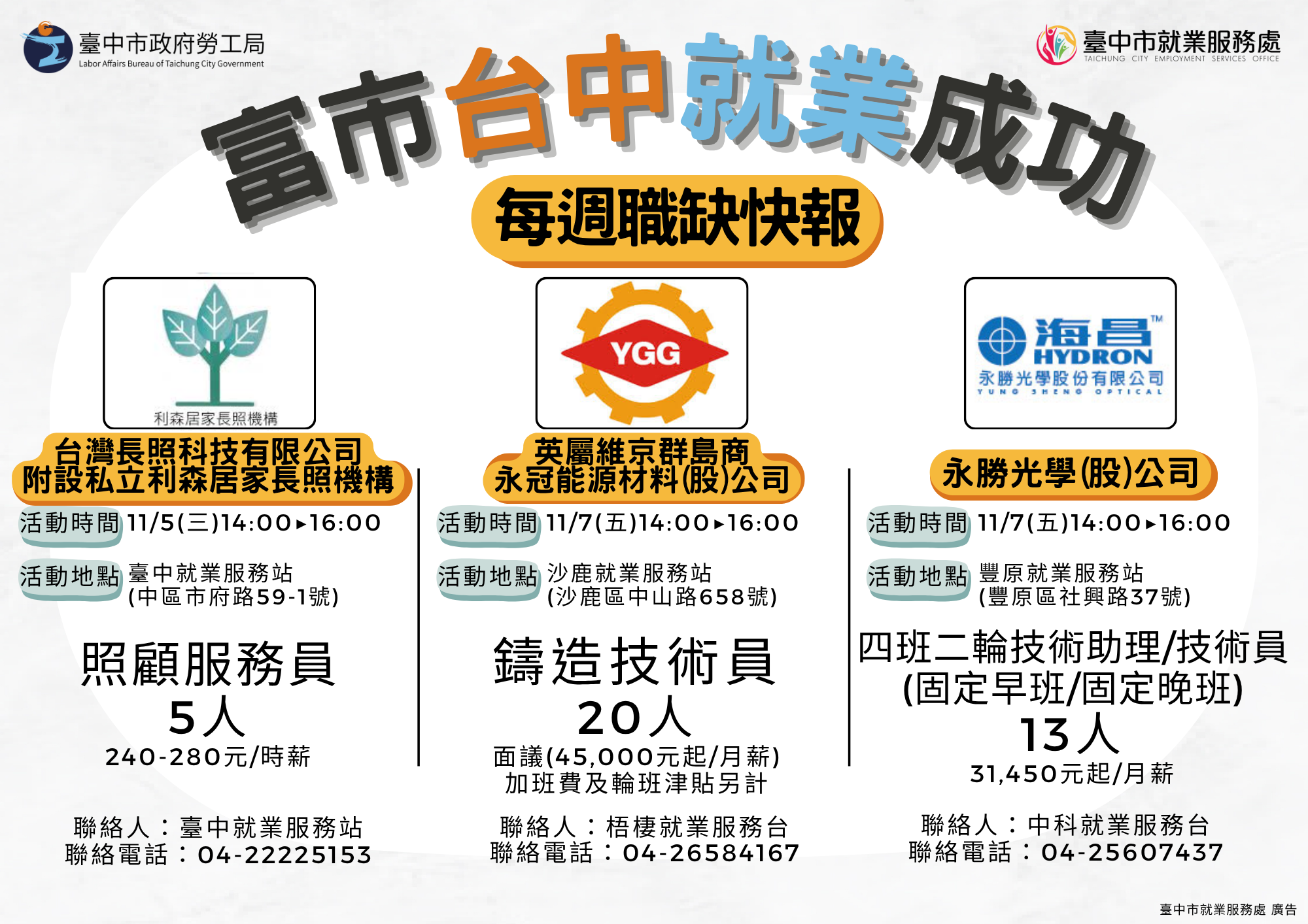 臺中市政府職缺快 報來囉!11/3-11/7邀請利森居家長照、永冠能源、永勝光學等廠商,辦理7場徵才,提供157個職缺,查詢更多職缺資訊:https://gov.tw/XJo,請洽04-22289111轉36100洽詢。