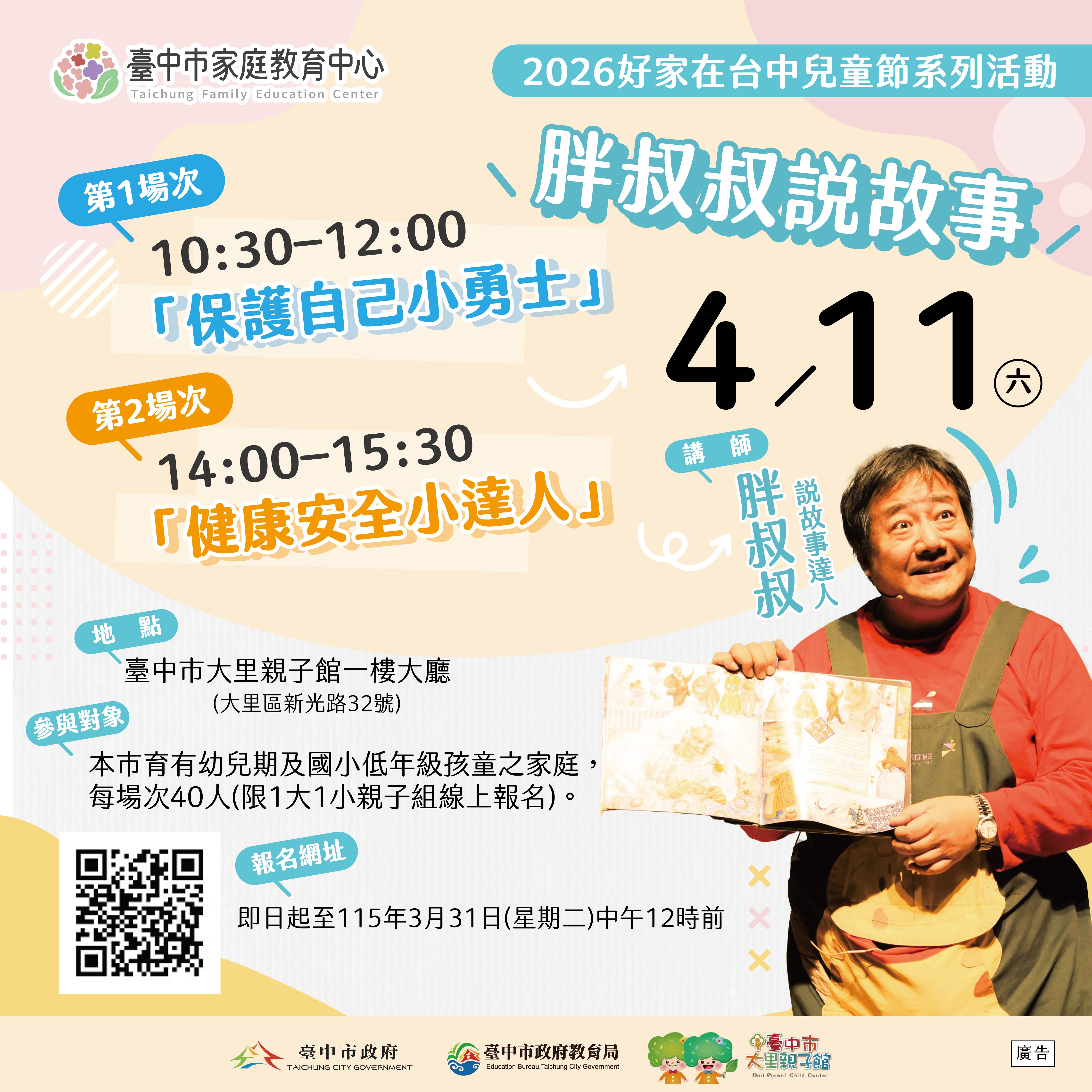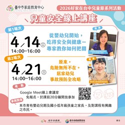 臺中市家庭教育中心舉辦「2026好家在台中兒童節系列活動」係為提升家長親職知能,協助家長瞭解不同年段的孩子在各成長階段的發展與需求、培養正向的教養態度,並透過活動或體驗方式增進家人互動關係,藉以培養經營家庭所需能力。