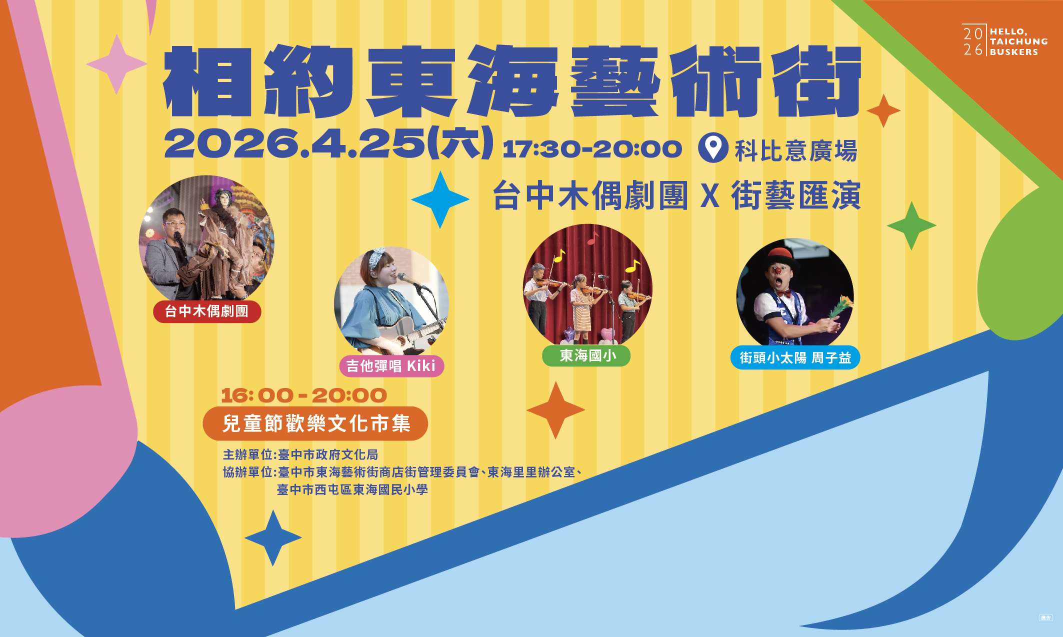 臺中市政府文化局「相約東海藝術街:台中木偶劇團X街藝匯演」戶外演出活動,將於115年4月25日(六)下午5時30分於東海藝術街「科比意廣場」辦理。